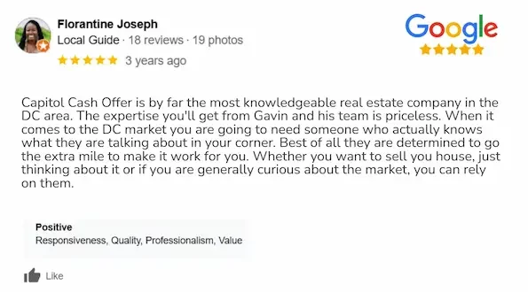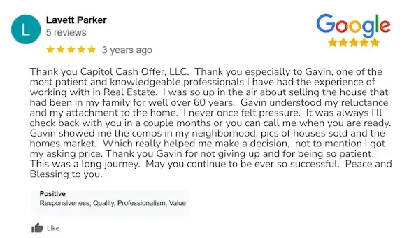 “I had a fantastic experience with Capitol Cash Offer. They made selling my house so easy and stress-free. I didn’t need to make repairs or pay any fees. Their team was friendly, professional, and quick. I got a great cash offer and fast payment. Highly recommend!”
